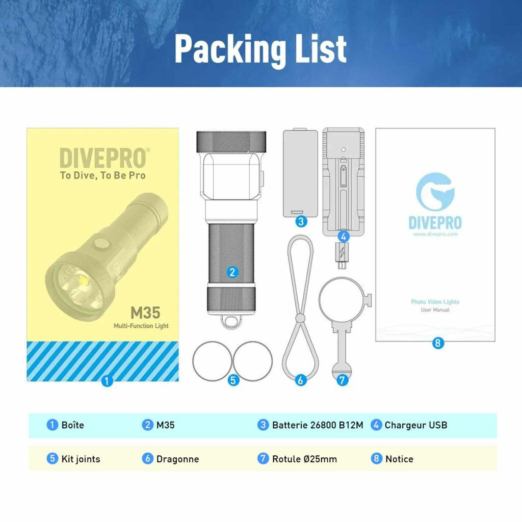 - Alimentation : 1 batterie lithium Divepro B03 26800 / 6800 mAh